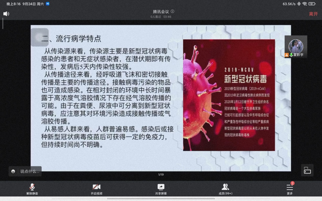 2022年9月24日,z6mg人生就是博官网“同心战‘疫’ 我是防疫科普员”主题活动进行第二期,由本科生第三党支部承办,为公司同学们讲解疫情期间如何做好个人防护。活动以线上主题党日活动的方式进行,由本科生第三党支部书记符广兴主讲,19级、20级、21级党员和22级3班及社会工作班全体员工参加。