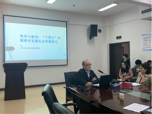 马峰副研究员做了关于《变局与新局:十四五时期青年发展社会环境变迁》的报告。围绕青年发展与社会变迁之间的关系,分别从经济社会发展、教育以及就业等角度讲述社会变迁对当代青年的影响并分析原因,提出了青年发展的塑造路径,激励当代青年立志奋斗。