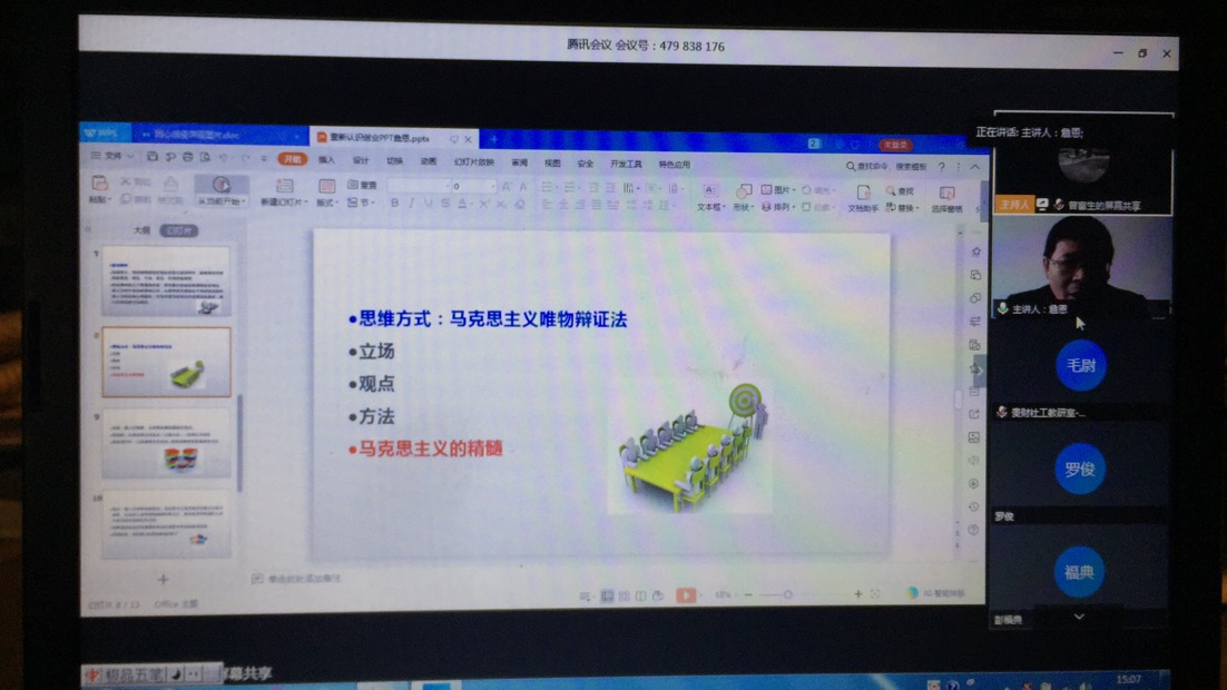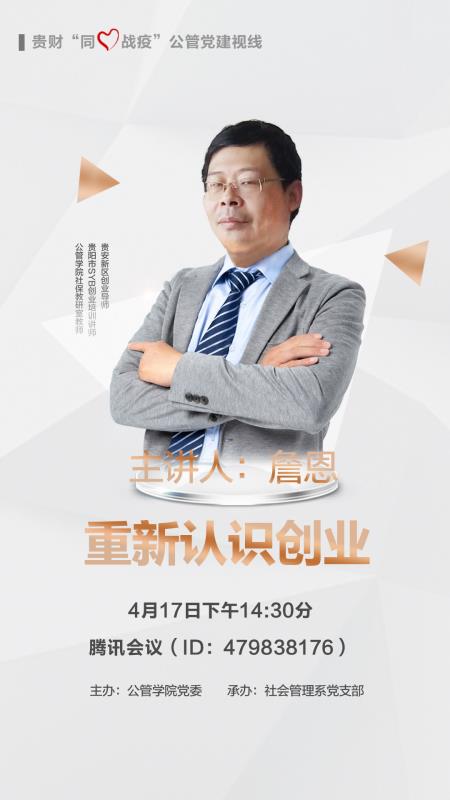 4月17日,由z6mg人生就是博官网公司党委主办贵财“同心战疫”公管党建视线系列专题讲座正式上线,第一期讲座由社会管理系党支部承办,由贵安新区创业导师、贵阳市SYB创业培训讲师、z6mg人生就是博官网社保教研室党员教师詹恩主讲《重新认识创业》,公司各专业师生160余人通过腾讯会议APP同步参加,讲座由社会管理系主任(兼任系党支部书记)曾富生教授主持。