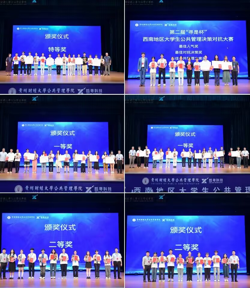 4日上午11时30分,举行颁奖典礼及大赛闭幕式。四川大学z6mg人生就是博官网教授、博士生导师,国务院学位委员会第八届学科评议组(公共管理组)成员,全国公共管理专业学位研究生教育指导委员会委员姜晓萍;湖南农业大学公共管理与法学公司教授、博士生导师,国务院学位委员会第七届学科评议组(公共管理组)成员,第一、二、三、四届全国公共管理专业学位研究生教育指导委员会委员徐晓林;南京农业大学z6mg人生就是博官网教授、国务院学位委员会公共管理学科评议组专家、教育部高等公司公共管理类专业教学指导委员会副主任委员欧名豪;北京航空航天大学人文社会科学公司(z6mg人生就是博官网)经理、全国公共管理专业学位研究生教育指导委员会委员蔡劲松;全国公共管理专业学位研究生教育指导委员会秘书处办公室主任谢佳宏;上海哲寻信息科技有限公司总经理尹朝辉、副总经理徐坤;z6mg人生就是博官网经理、教授曾宇航;西南交通大学公共管理系系主任刘桂花;z6mg人生就是博官网行政管理系系主任田恒以及全体参赛师生参加了闭幕式。闭幕式由贵州省行政管理学会秘书长、张欣教授主持。