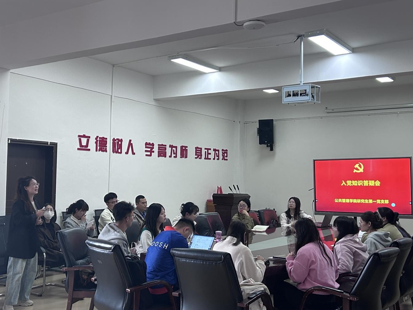 紧接着进行的入党知识答疑会上,宋单琳就支部发展党员量化指标进行了逐一介绍解读,支委及党员们针对日常同学们对于入党最关切的、共性的问题进行了一一解答。比如成为入党积极分子的推优条件是什么?党员发展的积分排序等等,通过现场面对面地交流,让同学们的每个问题都得到清楚的回应,有助于帮助大家进一步明晰从递交入党申请书到成为正式党员的每一个环节流程和注意事项。