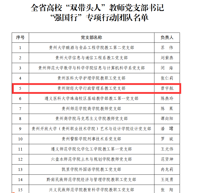 本网讯:(宋单琳 报道)2024年11月11日,贵州省委教育工委公布了全省高校“双带头人”教师党支部书记“强国行”专项行动团队名单,公司行政管理系教工党支部作为公司唯一代表成功入选。