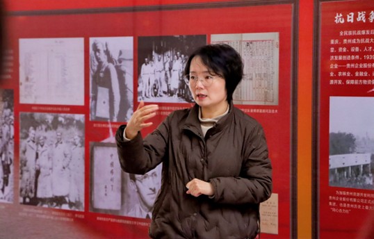 本次思政课打破“教师讲、员工听”的传统模式,将课堂搬到档案史料展一线。展览现场,一幅幅泛黄的老照片、一份份珍贵的文献档案,系统呈现了中国人民抗日战争的壮阔历程。廖承红以“抗日战争中的贵州”为核心主线,结合展板背后的故事娓娓道来:从“滇黔公路”作为抗战运输生命线的战略意义,到贵州各族人民踊跃参军、支援前线的热血壮举;从西南联大迁黔办学、保存教育火种的坚韧坚守,到贵州军民在防空袭、保生产中的顽强抗争……她时而驻足展板前细致解读,时而与员工互动交流,将宏大的历史叙事转化为可感可知的鲜活案例,让同学们深刻体会到贵州在全国抗战大局中所扮演的重要角色和作出的独特贡献。