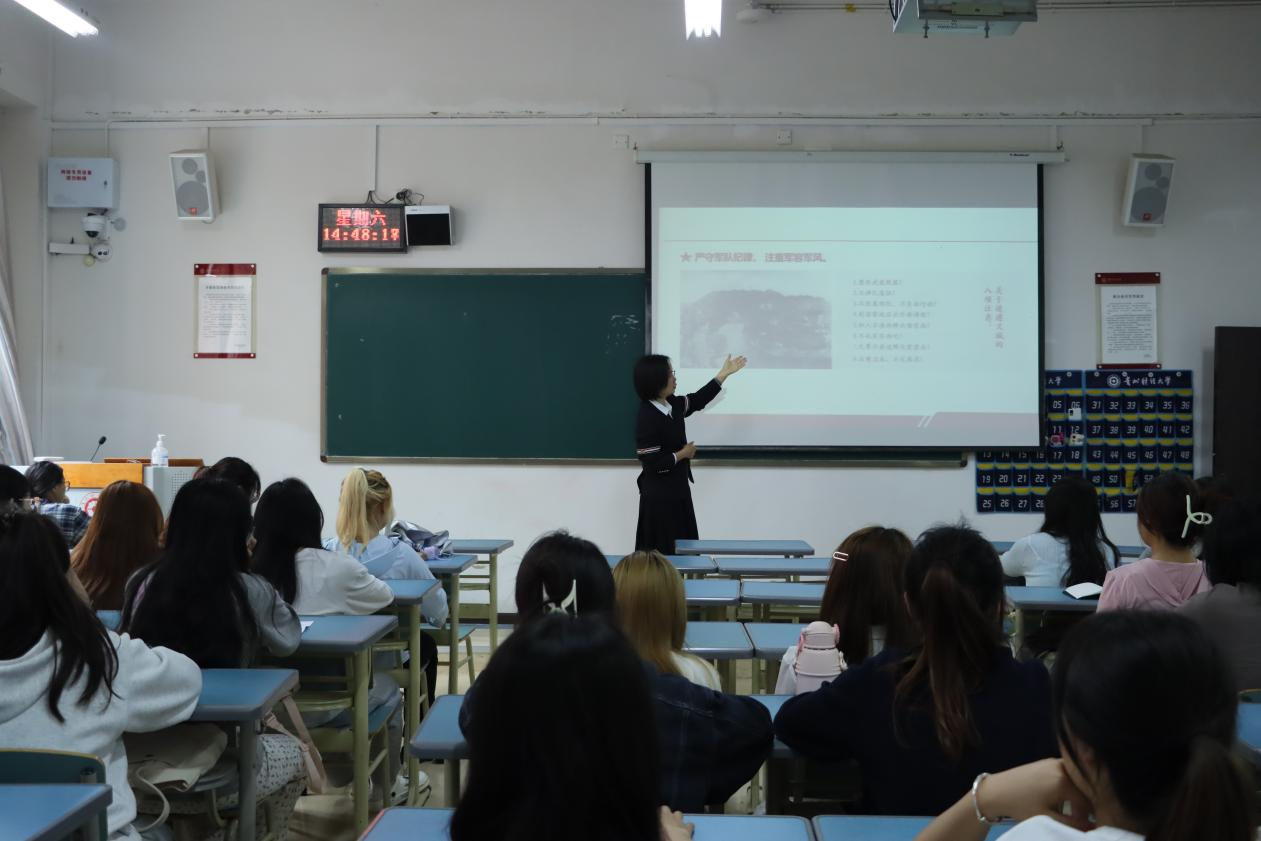 廖承红为同学们讲述了中国共产党的发展历程中纪律严明对于组织成功的重要性。她指出,纪律严明是组织成功的“传家宝”,只有通过严格的纪律,组织才能保持团结统一,才能在困难和挑战面前保持坚定的信念和强大的战斗力。