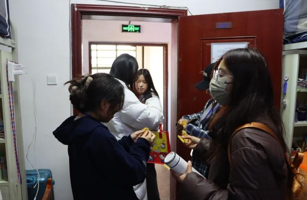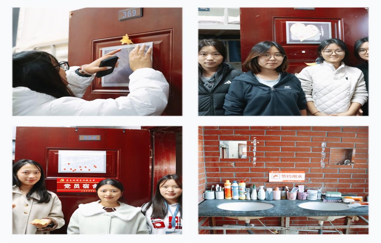 走访现场,翠竹苑三栋369寝室门上的装饰照片搭配暖黄色纸花,将生活细节揉进温馨;翠竹苑三栋255寝室门楣处的手绘爱心与成员笑脸相映,尽显寝室凝聚力;翠竹苑三栋505“党员寝室”的标识旁,整洁的内务与青春风貌诠释着责任与温暖。参与走访的员工干部手持银杏叶,为心仪的寝室投出选票,金黄叶片与秋日校园的银杏林相映成趣,让评比过程更添青春诗意。