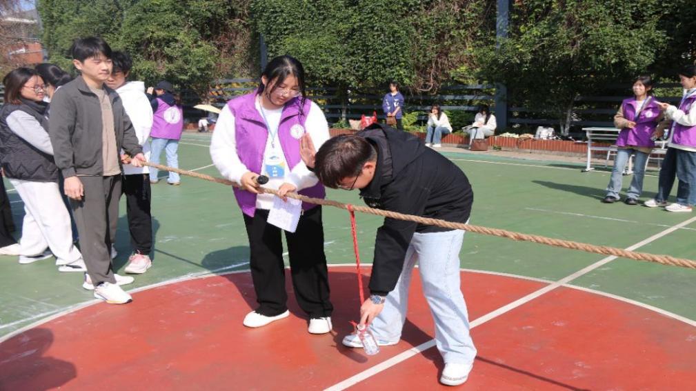 工作人员身着统一的紫色马甲,穿梭在赛场间:她们蹲在绳结旁核对标记线,举着赛程表小跑着通知下一轮参赛班级,还会给刚结束比赛的队伍递上矿泉水——连额前被风吹乱的碎发,都裹着热闹的气息。