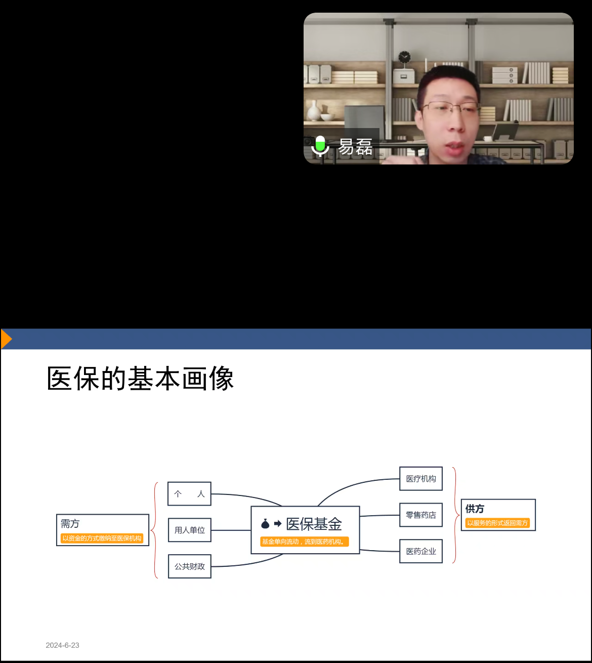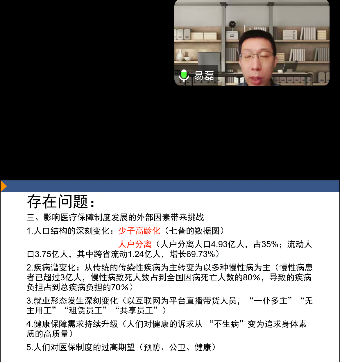 本网讯:(刘杰 图文报道)2024年6月23日早上,一场关于深化医疗保障制度改革前瞻的学术讲座通过腾讯会议成功举办。本次讲座邀请贵州省医疗保障局易磊处长,就中国特色医疗保障制度体系改革和发展进行了深入探讨。