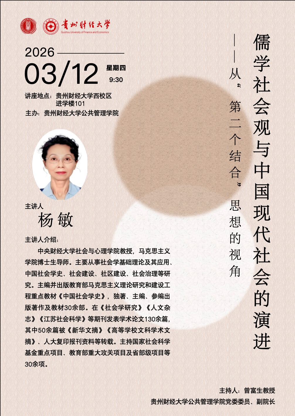 中央财经大学杨敏教授讲座预告——儒学社会观与中国现代社会的演进——从”第二个结合“思想的视角