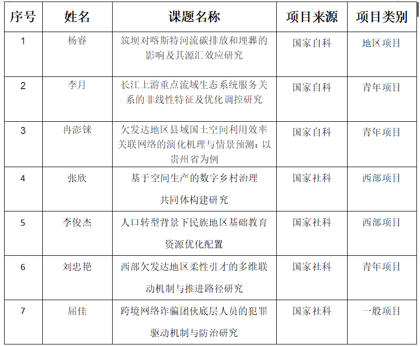 其中,获批2024年度国家自然科学基金的3项课题为:(1)杨睿:筑坝对喀斯特河流碳排放和埋葬的影响及其源汇效应研究(42462027);(2)李月:长江上游重点流域生态系统服务关系的非线性特征及优化调控研究(42401358);(3)冉澎铼:欠发达地区县域国土空间利用效率关联网络的演化机理与情景预测:以贵州省为例(42401322)。获批2024年度国家社会科学基金项目的4项课题为:(1)张欣:基于空间生产的数字乡村治理共同体构建研究(24XZZ006);(2)李俊杰:人口转型背景下民族地区基础教育资源优化配置(24XMZ052);(3)刘忠艳:西部欠发达地区柔性引才的多维联动机制与推进路径研究(24CGL124);(4)屈佳:跨境网络诈骗团伙底层人员的犯罪驱动机制与防治研究(24BSH031)。