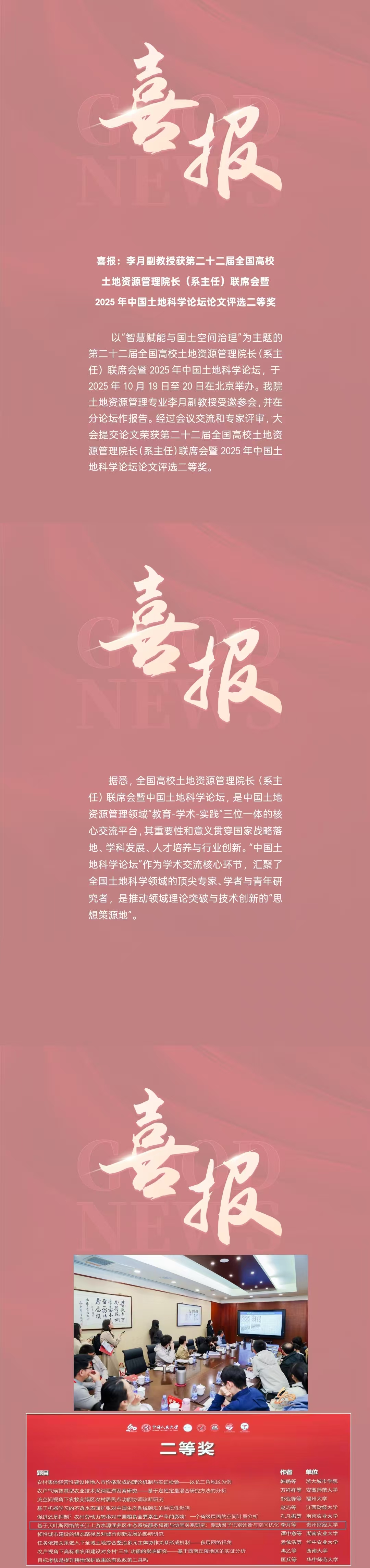 喜讯:李月副教授获第二十二届全国高校土地资源管理经理(系主任)联席会暨2025年中国土地科学论坛论文评选二等奖