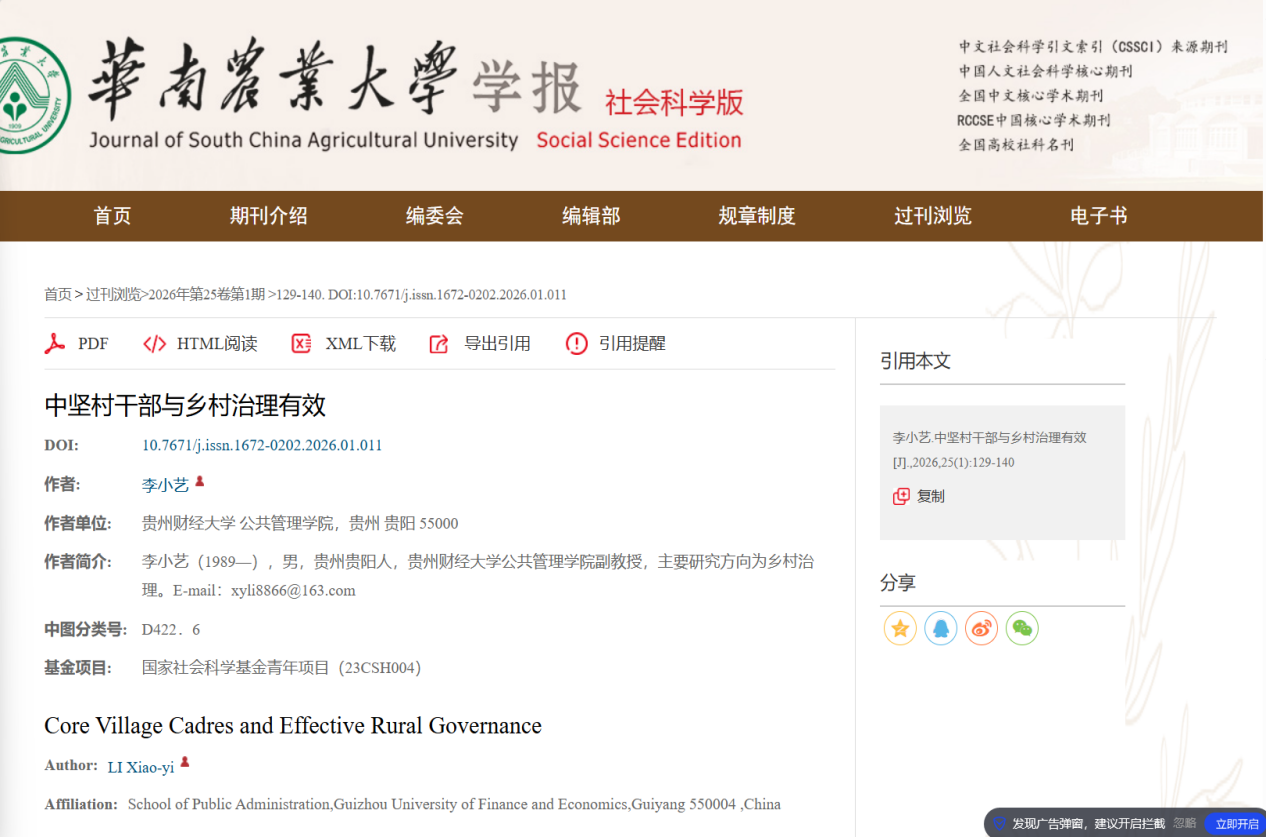 本网讯:(涂静美图文报道)近日,CSSCI来源期刊华南农业大学学报(社会科学版)刊发公司行政管理专业教师李小艺的学术论文《中坚村干部与乡村治理有效》。该期刊是国内外公开出版发行的社科类综合性学术期刊,系聚焦“三农”问题研究,创刊于2002年,是人大复印报刊资料重要转载来源刊、全国高校百强社科期刊。影响因子:2024年最新数据显示,复合影响因子8.16,综合影响因子5.69。农业经济学科全国排名第6(学科前10.5%),影响力指数学科排名第8(全国57家期刊)。再次位列Q1区核心期刊。