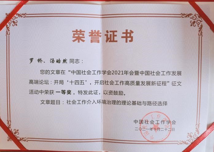 1)中国社会工作学会2021年会暨中国社会工作发展高端论坛征文大赛一等奖。