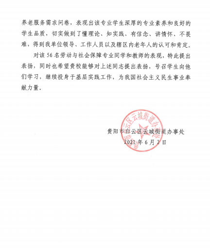 近日,贵阳市白云区云城街道办事处向公司来信,对公司劳动与社会保障专业本科生谢佳佳、张锡梅、杨登华、赵羽、王丹、易佳月、赵红艳、周慧、任星、丁维岩等56名同学于2021年5月21日到5月22日期间在公司社会管理系罗艳老师带领下,在其单位开展养老服务需求调查活动提出表扬。